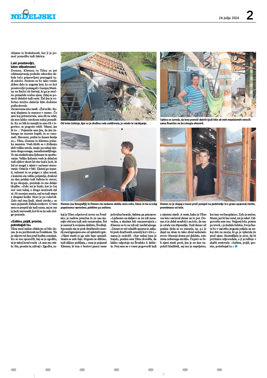 Močno neurje s točo, ki je v soboto, 13. julija, prizadelo območje občine Slovenska Bistrica, je mojo hišo uničilo do te mere, da ni več primerna za bivanje. Popolnoma mi je uničilo streho, posledično je v notranje prostore povsod tekla voda, skozi vtičnice in luči ter skozi mavčne plošče, v prostorih smo imeli 15 centimetrov vode. Zaradi tega moramo v celoviti prenoviti streho, menjati oz. prenoviti strope, stene in pode. Prav tako je uničeno in zelo poškodovano praktično novo pohištvo saj sem kljub skromnim dohodkom, hišo pred kratkim začeli obnavljati. Zato je to za mojo družino še toliko večji udarec.